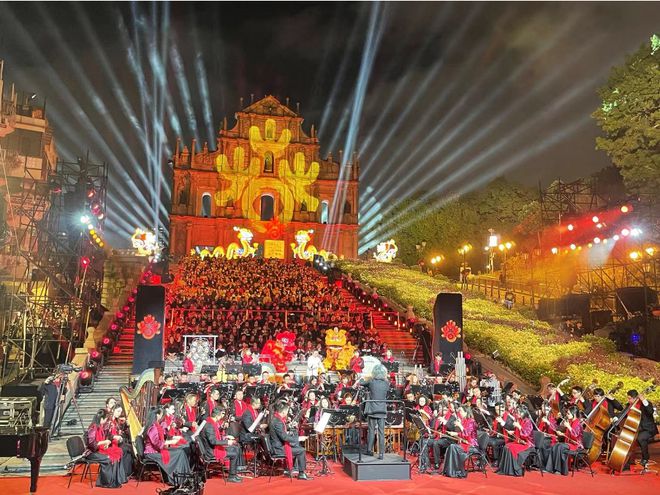 中新社北京2月4日电(记者 应妮)3日晚,澳门大三巴牌坊前的广场上,澳门中乐团携手中外艺术家联袂带来《春节序曲》《春舞》《澳门随想曲》等经典乐曲,为2024年“欢乐春节”拉开大幕;驻守在中国空间站的航天员手持“欢乐春节”吉祥龙,通过视频方式向现场观众和全球华人送上来自“天宫”的龙年新春祝福……